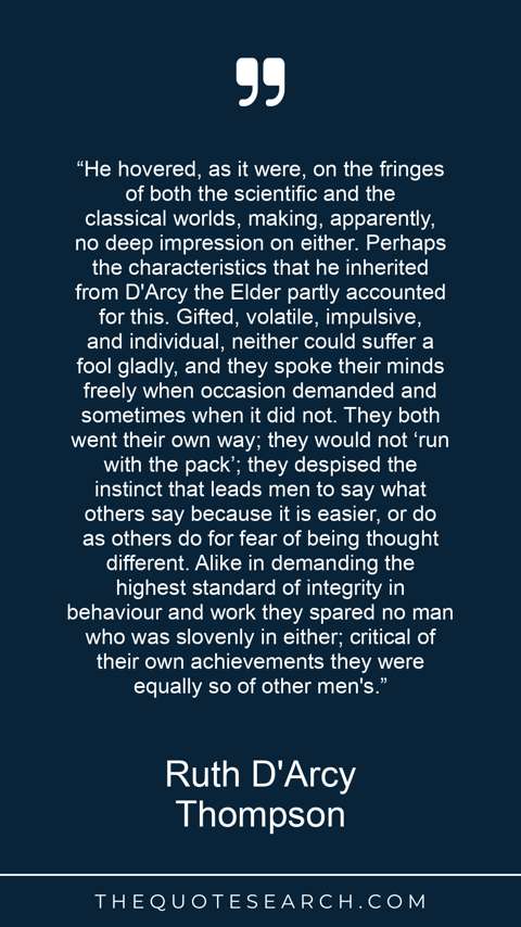 “He hovered, as it were, on the fringes of both the scientific and the classical worlds, making, apparently, no deep impression on either. Perhaps the characteristics that he inherited from D'Arcy the Elder partly accounted for this. Gifted, volatile, impulsive, and individual, neither could suffer a fool gladly, and they spoke their minds freely when occasion demanded and sometimes when it did not. They both went their own way; they would not ‘run with the pack’; they despised the instinct that leads men to say what others say because it is easier, or do as others do for fear of being thought different. Alike in demanding the highest standard of integrity in behaviour and work they spared no man who was slovenly in either; critical of their own achievements they were equally so of other men's.”