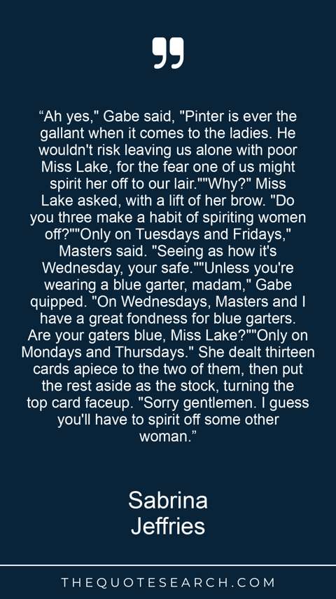 “Ah yes," Gabe said, "Pinter is ever the gallant when it comes to the ladies. He wouldn't risk leaving us alone with poor Miss Lake, for the fear one of us might spirit her off to our lair.""Why?" Miss Lake asked, with a lift of her brow. "Do you three make a habit of spiriting women off?""Only on Tuesdays and Fridays," Masters said. "Seeing as how it's Wednesday, your safe.""Unless you're wearing a blue garter, madam," Gabe quipped. "On Wednesdays, Masters and I have a great fondness for blue garters. Are your gaters blue, Miss Lake?""Only on Mondays and Thursdays." She dealt thirteen cards apiece to the two of them, then put the rest aside as the stock, turning the top card faceup. "Sorry gentlemen. I guess you'll have to spirit off some other woman.”