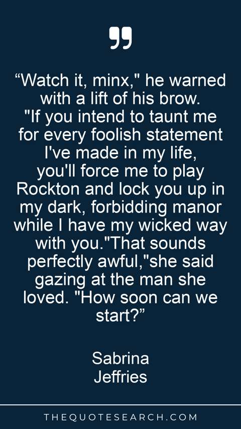 “Watch it, minx," he warned with a lift of his brow. "If you intend to taunt me for every foolish statement I've made in my life, you'll force me to play Rockton and lock you up in my dark, forbidding manor while I have my wicked way with you."That sounds perfectly awful,"she said gazing at the man she loved. "How soon can we start?”