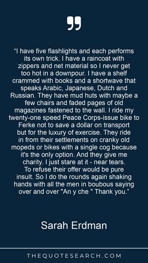 “I have five flashlights and each performs its own trick. I have a raincoat with zippers and net material so I never get too hot in a downpour. I have a shelf crammed with books and a shortwave that speaks Arabic, Japanese, Dutch and Russian. They have mud huts with maybe a few chairs and faded pages of old magazines fastened to the wall. I ride my twenty-one speed Peace Corps-issue bike to Ferke not to save a dollar on transport but for the luxury of exercise. They ride in from their settlements on cranky old mopeds or bikes with a single cog because it's the only option. And they give me charity. I just stare at it - near tears. To refuse their offer would be pure insult. So I do the rounds again shaking hands with all the men in boubous saying over and over "An y che " Thank you.”