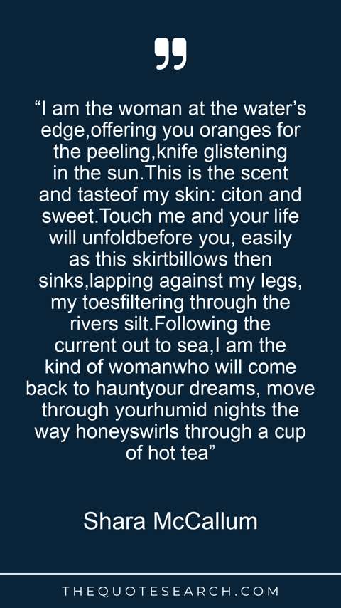 “I am the woman at the water’s edge,offering you oranges for the peeling,knife glistening in the sun.This is the scent and tasteof my skin: citon and sweet.Touch me and your life will unfoldbefore you, easily as this skirtbillows then sinks,lapping against my legs, my toesfiltering through the rivers silt.Following the current out to sea,I am the kind of womanwho will come back to hauntyour dreams, move through yourhumid nights the way honeyswirls through a cup of hot tea”