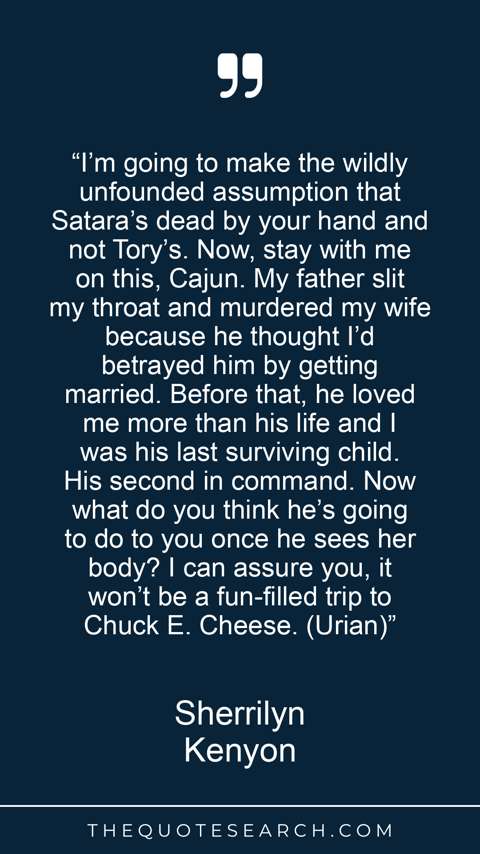 “I’m going to make the wildly unfounded assumption that Satara’s dead by your hand and not Tory’s. Now, stay with me on this, Cajun. My father slit my throat and murdered my wife because he thought I’d betrayed him by getting married. Before that, he loved me more than his life and I was his last surviving child. His second in command. Now what do you think he’s going to do to you once he sees her body? I can assure you, it won’t be a fun-filled trip to Chuck E. Cheese. (Urian)”