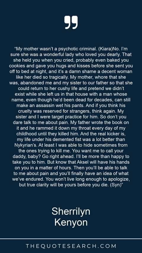 “My mother wasn’t a psychotic criminal. (Kiara)No. I’m sure she was a wonderful lady who loved you dearly. That she held you when you cried, probably even baked you cookies and gave you hugs and kisses before she sent you off to bed at night, and it’s a damn shame a decent woman like her died so tragically. My mother, whore that she was, abandoned me and my sister to our father so that she could return to her cushy life and pretend we didn’t exist while she left us in that house with a man whose name, even though he’d been dead for decades, can still make an assassin wet his pants. And if you think his cruelty was reserved for strangers, think again. My sister and I were target practice for him. So don’t you dare talk to me about pain. My father wrote the book on it and he rammed it down my throat every day of my childhood until they killed him. And the real kicker is, my life under his demented fist was a lot better than Nykyrian’s. At least I was able to hide sometimes from the ones trying to kill me. You want me to call your daddy, baby? Go right ahead. I’ll be more than happy to take you to him. But know that Aksel will have his hands on you in a matter of hours. Then you’ll be able to talk to me about pain and you’ll finally have an idea of what we’ve endured. You won’t live long enough to apologize, but true clarity will be yours before you die. (Syn)”