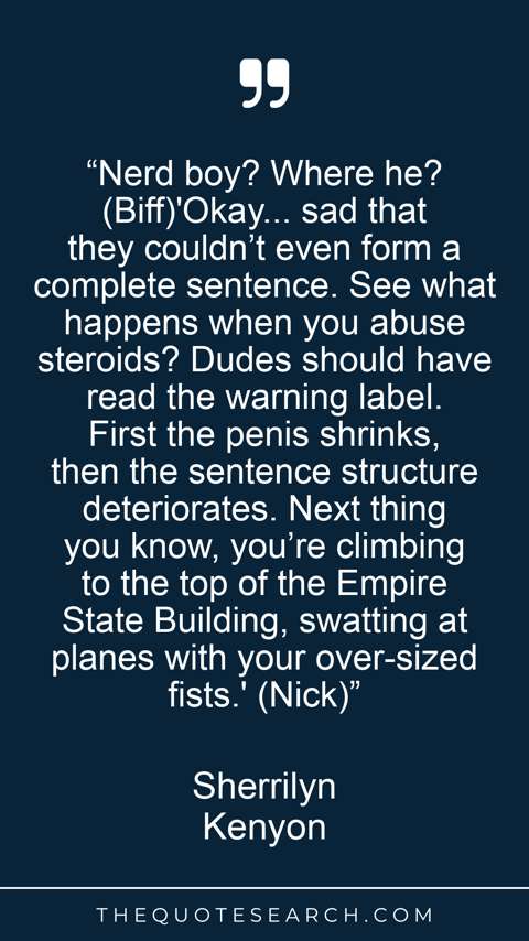 “Nerd boy? Where he? (Biff)'Okay... sad that they couldn’t even form a complete sentence. See what happens when you abuse steroids? Dudes should have read the warning label. First the penis shrinks, then the sentence structure deteriorates. Next thing you know, you’re climbing to the top of the Empire State Building, swatting at planes with your over-sized fists.' (Nick)”