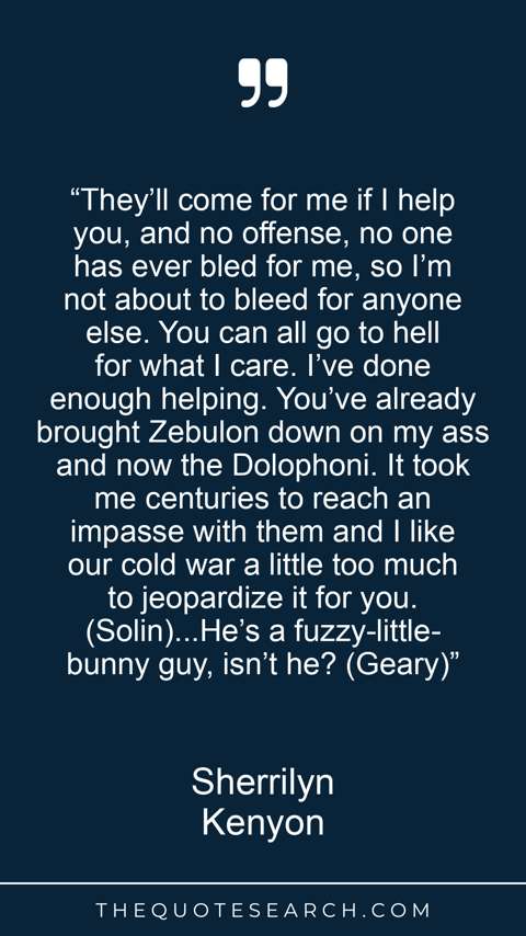“They’ll come for me if I help you, and no offense, no one has ever bled for me, so I’m not about to bleed for anyone else. You can all go to hell for what I care. I’ve done enough helping. You’ve already brought Zebulon down on my ass and now the Dolophoni. It took me centuries to reach an impasse with them and I like our cold war a little too much to jeopardize it for you. (Solin)...He’s a fuzzy-little-bunny guy, isn’t he? (Geary)”