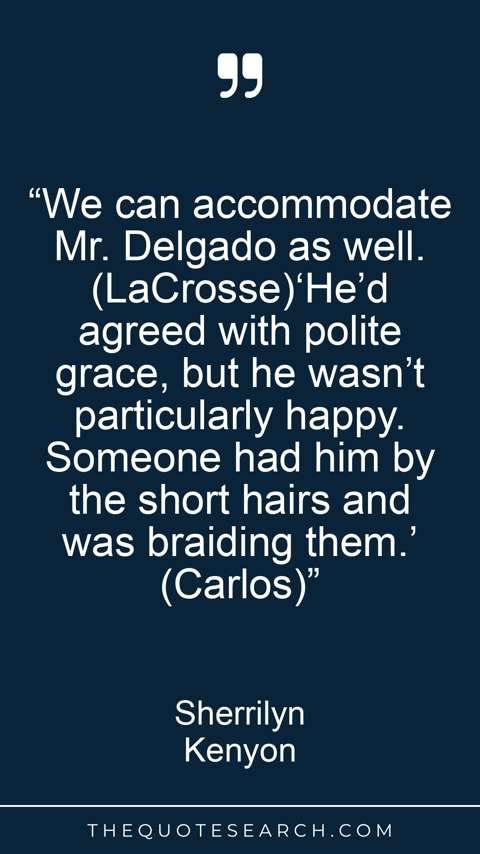 “We can accommodate Mr. Delgado as well. (LaCrosse)‘He’d agreed with polite grace, but he wasn’t particularly happy. Someone had him by the short hairs and was braiding them.’ (Carlos)”