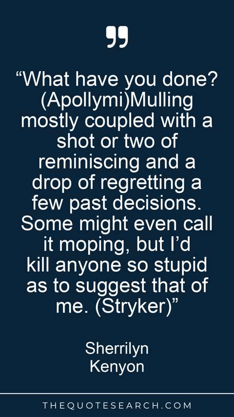 “What have you done? (Apollymi)Mulling mostly coupled with a shot or two of reminiscing and a drop of regretting a few past decisions. Some might even call it moping, but I’d kill anyone so stupid as to suggest that of me. (Stryker)”
