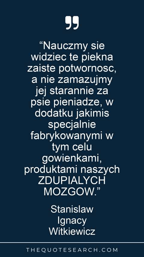 “Nauczmy sie widziec te piekna zaiste potwornosc, a nie zamazujmy jej starannie za psie pieniadze, w dodatku jakimis specjalnie fabrykowanymi w tym celu gowienkami, produktami naszych ZDUPIALYCH MOZGOW.”