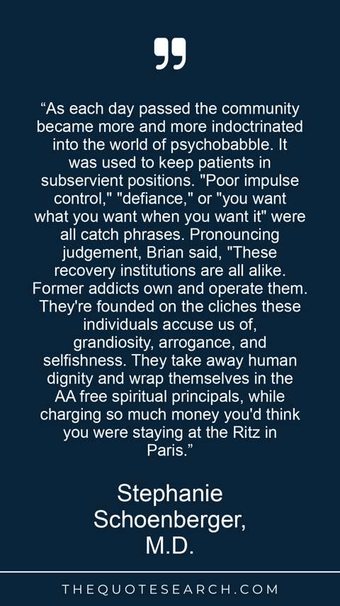 “As each day passed the community became more and more indoctrinated into the world of psychobabble. It was used to keep patients in subservient positions. "Poor impulse control," "defiance," or "you want what you want when you want it" were all catch phrases. Pronouncing judgement, Brian said, "These recovery institutions are all alike. Former addicts own and operate them. They're founded on the cliches these individuals accuse us of, grandiosity, arrogance, and selfishness. They take away human dignity and wrap themselves in the AA free spiritual principals, while charging so much money you'd think you were staying at the Ritz in Paris.”