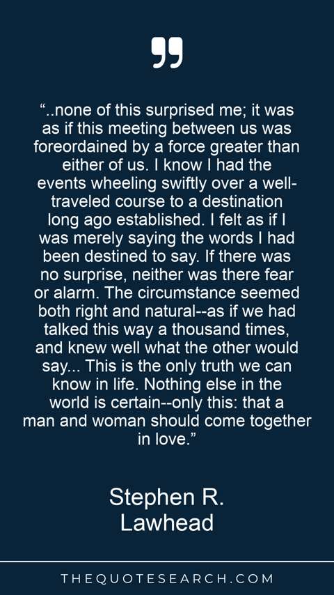 “..none of this surprised me; it was as if this meeting between us was foreordained by a force greater than either of us. I know I had the events wheeling swiftly over a well-traveled course to a destination long ago established. I felt as if I was merely saying the words I had been destined to say. If there was no surprise, neither was there fear or alarm. The circumstance seemed both right and natural--as if we had talked this way a thousand times, and knew well what the other would say... This is the only truth we can know in life. Nothing else in the world is certain--only this: that a man and woman should come together in love.”