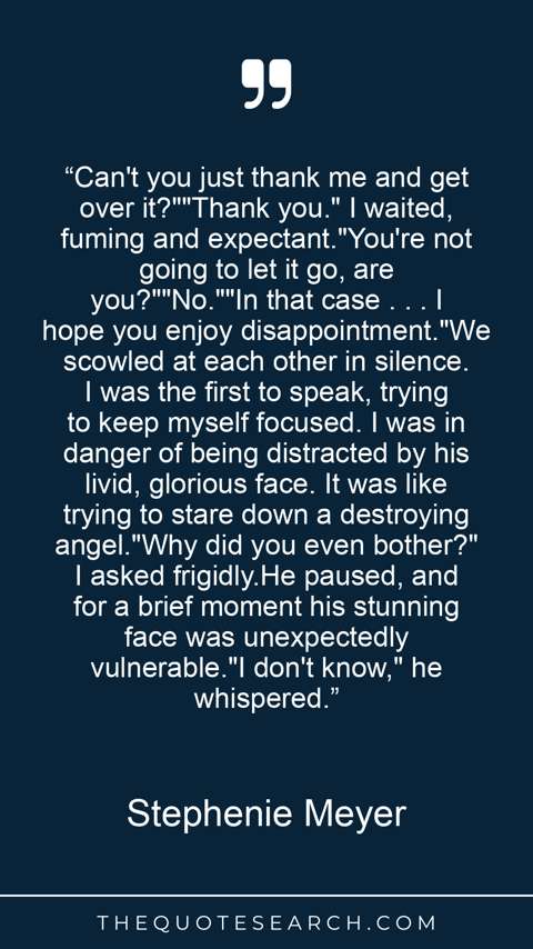 “Honestly, Edward." I felt a thrill go through me as I said his name, and I hated it. "I can't keep up with you. I thought you didn't want to be my friend.""I said it would be better if we weren't friends, not that I didn't want to be.""Oh, thanks, now that's all cleared up." Heavy sarcasm. I realized I had stopped walking again. We were under the shelter of the cafeteria roof now, so I could more easily look at his face. Which certainly didn't help my clarity of thought."It would be more . . . prudent for you not to be my friend," he explained. "But I'm tired of trying to stay away from you, Bella."His eyes were gloriously intense as he uttered that last sentence, his voice smoldering. I couldn't remember how to breathe.”