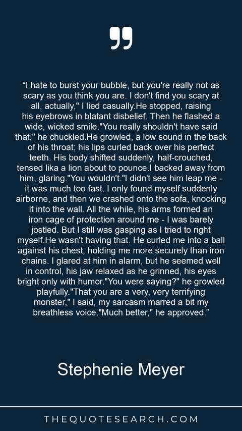 “I hate to burst your bubble, but you're really not as scary as you think you are. I don't find you scary at all, actually," I lied casually.He stopped, raising his eyebrows in blatant disbelief. Then he flashed a wide, wicked smile."You really shouldn't have said that," he chuckled.He growled, a low sound in the back of his throat; his lips curled back over his perfect teeth. His body shifted suddenly, half-crouched, tensed lika a lion about to pounce.I backed away from him, glaring."You wouldn't."I didn't see him leap me - it was much too fast. I only found myself suddenly airborne, and then we crashed onto the sofa, knocking it into the wall. All the while, his arms formed an iron cage of protection around me - I was barely jostled. But I still was gasping as I tried to right myself.He wasn't having that. He curled me into a ball against his chest, holding me more securely than iron chains. I glared at him in alarm, but he seemed well in control, his jaw relaxed as he grinned, his eyes bright only with humor."You were saying?" he growled playfully."That you are a very, very terrifying monster," I said, my sarcasm marred a bit my breathless voice."Much better," he approved.”