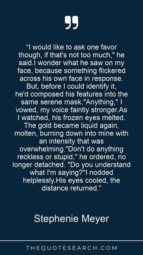 “I would like to ask one favor though, if that's not too much," he said.I wonder what he saw on my face, because something flickered across his own face in response. But, before I could identify it, he'd composed his features into the same serene mask."Anything," I vowed, my voice faintly stronger.As I watched, his frozen eyes melted. The gold became liquid again, molten, burning down into mine with an intensity that was overwhelming."Don't do anything reckless or stupid," he ordered, no longer detached. "Do you understand what I'm saying?"I nodded helplessly.His eyes cooled, the distance returned.”
