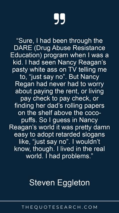 “Sure, I had been through the DARE (Drug Abuse Resistance Education) program when I was a kid. I had seen Nancy Reagan’s pasty white ass on TV telling me to, “just say no”. But Nancy Regan had never had to worry about paying the rent, or living pay check to pay check, or finding her dad’s rolling papers on the shelf above the coco-puffs. So I guess in Nancy Reagan’s world it was pretty damn easy to adopt retarded slogans like, “just say no”. I wouldn’t know, though. I lived in the real world. I had problems.”