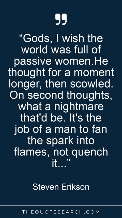 “Gods, I wish the world was full of passive women.He thought for a moment longer, then scowled. On second thoughts, what a nightmare that'd be. It's the job of a man to fan the spark into flames, not quench it...”