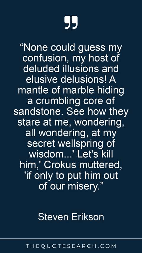 “None could guess my confusion, my host of deluded illusions and elusive delusions! A mantle of marble hiding a crumbling core of sandstone. See how they stare at me, wondering, all wondering, at my secret wellspring of wisdom...' Let's kill him,' Crokus muttered, 'if only to put him out of our misery.”