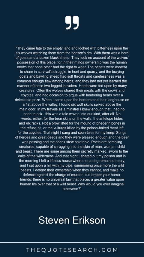 “They came late to the empty land and looked with bitterness upon the six wolves watching them from the horizon's rim. With them was a herd of goats and a dozen black sheep. They took no account of the wolves' possession of this place, for in their minds ownership was the human crown that none other had the right to wear. The beasts were content to share in survival's struggle, in hunt and quarry, and the braying goats and bawling sheep had soft throats and carelessness was a common enough flaw among herds; and they had not yet learned the manner of these two-legged intruders. Herds were fed upon by many creatures. Often the wolves shared their meals with the crows and coyotes, and had occasion to argue with lumbering bears over a delectable prize. When I came upon the herders and their longhouse on a flat above the valley, I found six wolf skulls spiked above the main door. In my travels as a minstrel I knew enough that I had no need to ask - this was a tale woven into our kind, after all. No words, either, for the bear skins on the walls, the antelope hides and elk racks. Not a brow lifted for the mound of bhederin bones in the refuse pit, or the vultures killed by the poison-baited meat left for the coyotes. That night I sang and spun tales for my keep. Songs of heroes and great deeds and they were pleased enough and the beer was passing and the shank stew palatable. Poets are sembling creatures, capable of shrugging into the skin of man, woman, child and beast. There are some among them secretly marked, sworn to the cults of the wilderness. And that night I shared out my poison and in the morning I left a lifeless house where not a dog remained to cry, and I sat upon a hill with my pipe, summoning once more the wild beasts. I defend their ownership when they cannot, and make no defence against the charge of murder; but temper your horror, friends: there is no universal law that places a greater value upon human life over that of a wild beast. Why would you ever imagine otherwise?”