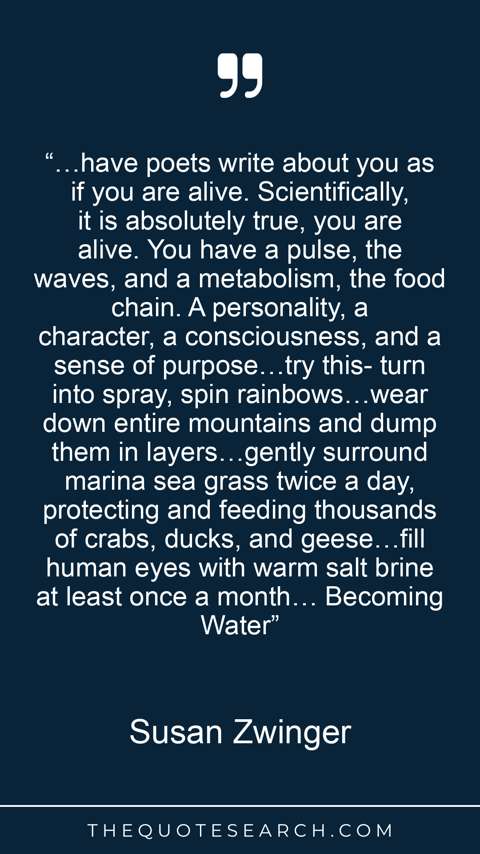 “…have poets write about you as if you are alive. Scientifically, it is absolutely true, you are alive. You have a pulse, the waves, and a metabolism, the food chain. A personality, a character, a consciousness, and a sense of purpose…try this- turn into spray, spin rainbows…wear down entire mountains and dump them in layers…gently surround marina sea grass twice a day, protecting and feeding thousands of crabs, ducks, and geese…fill human eyes with warm salt brine at least once a month… Becoming Water”
