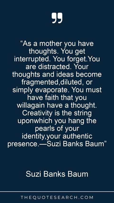“As a mother you have thoughts. You get interrupted. You forget.You are distracted. Your thoughts and ideas become fragmented,diluted, or simply evaporate. You must have faith that you willagain have a thought. Creativity is the string uponwhich you hang the pearls of your identity,your authentic presence.—Suzi Banks Baum”