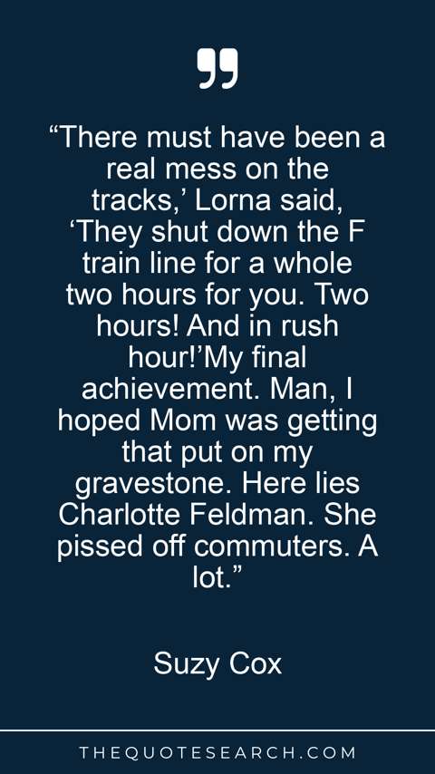 “There must have been a real mess on the tracks,’ Lorna said, ‘They shut down the F train line for a whole two hours for you. Two hours! And in rush hour!’My final achievement. Man, I hoped Mom was getting that put on my gravestone. Here lies Charlotte Feldman. She pissed off commuters. A lot.”