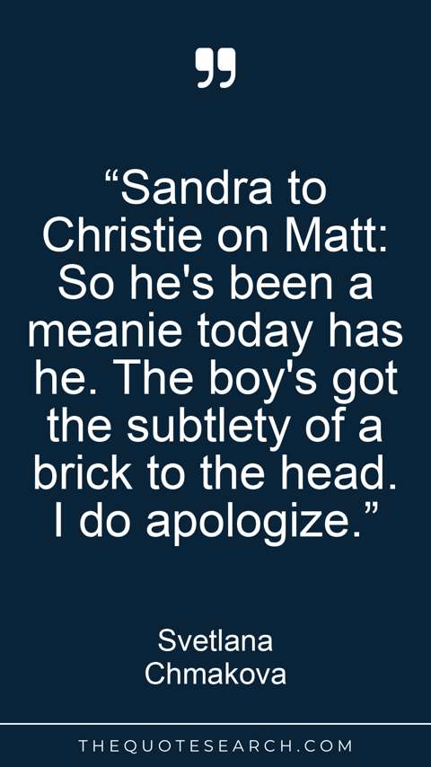 “Sandra to Christie on Matt: So he's been a meanie today has he. The boy's got the subtlety of a brick to the head. I do apologize.”