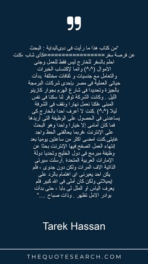 “من كتاب هذا ما رأيت فى دبىالبداية : البحث عن فرصة سفر=================كأى شاب ،كنت احلم بالسفر للخارج ليس فقط للعمل وجنى الاموال (^ـ^) وانما لإكتساب الخبرات والتعامل مع جنسيات و ثقافات مختلفة .بدأت حياتى العملية فى مصر بإحدى شركات البرمجة بالجيزة وتحديدا فى شارع الهرم بجوار كازينو الليل . وكانت الشركة توفر لنا سكنا فى نفس المبنى ،فكنا نعمل نهارا ونقف فى الشرفة ليلا (^ـ^) .كنت لا أعرف احدا بالخارج كى يساعدنى فى الحصول على الوظيفة التى أريدها فما كان أمامى إلا خيارا واحدا وهو البحث على الإنترنت ،فربما يحالفنى الحظ واجد غايتى.كنت امضى اكثر من ساعتين يوميا بعد إنتهاء العمل اتصفح فيها الإنترنت بحثا عن وظيفة مبرمج فى دول الخليج وتحديا دولة الإمارات العربية المتحدة .أرسلت سيرتى الذاتية الاف المرات ولكن دون جدوى ، فلم يكن احد يعيرنى اى اهتمام بالرد على إيميلاتى ولكن كان أملى فى الله كبير فلم يعرف الياس او الملل لى بابا ، حتى بدأت بوادر الامل تظهر . وذات صباح ....”