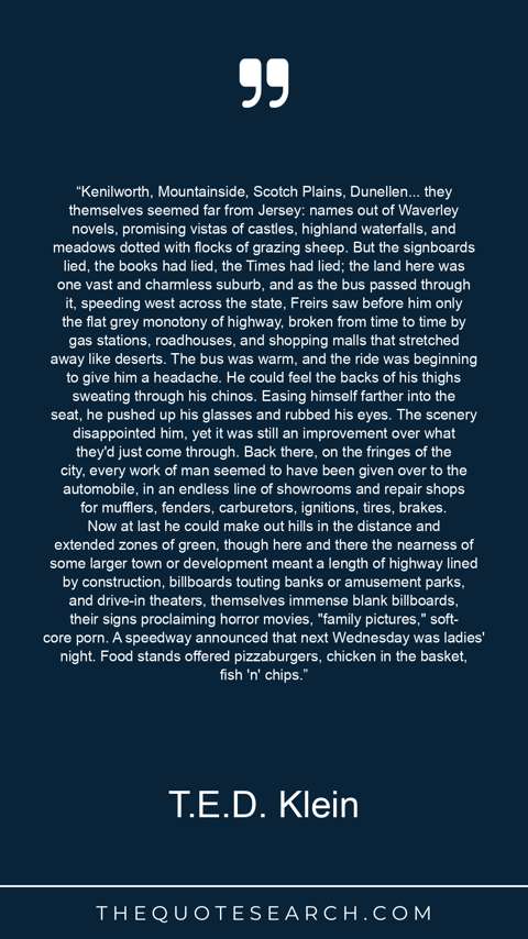 “Kenilworth, Mountainside, Scotch Plains, Dunellen... they themselves seemed far from Jersey: names out of Waverley novels, promising vistas of castles, highland waterfalls, and meadows dotted with flocks of grazing sheep. But the signboards lied, the books had lied, the Times had lied; the land here was one vast and charmless suburb, and as the bus passed through it, speeding west across the state, Freirs saw before him only the flat grey monotony of highway, broken from time to time by gas stations, roadhouses, and shopping malls that stretched away like deserts. The bus was warm, and the ride was beginning to give him a headache. He could feel the backs of his thighs sweating through his chinos. Easing himself farther into the seat, he pushed up his glasses and rubbed his eyes. The scenery disappointed him, yet it was still an improvement over what they'd just come through. Back there, on the fringes of the city, every work of man seemed to have been given over to the automobile, in an endless line of showrooms and repair shops for mufflers, fenders, carburetors, ignitions, tires, brakes. Now at last he could make out hills in the distance and extended zones of green, though here and there the nearness of some larger town or development meant a length of highway lined by construction, billboards touting banks or amusement parks, and drive-in theaters, themselves immense blank billboards, their signs proclaiming horror movies, "family pictures," soft-core porn. A speedway announced that next Wednesday was ladies' night. Food stands offered pizzaburgers, chicken in the basket, fish 'n' chips.”