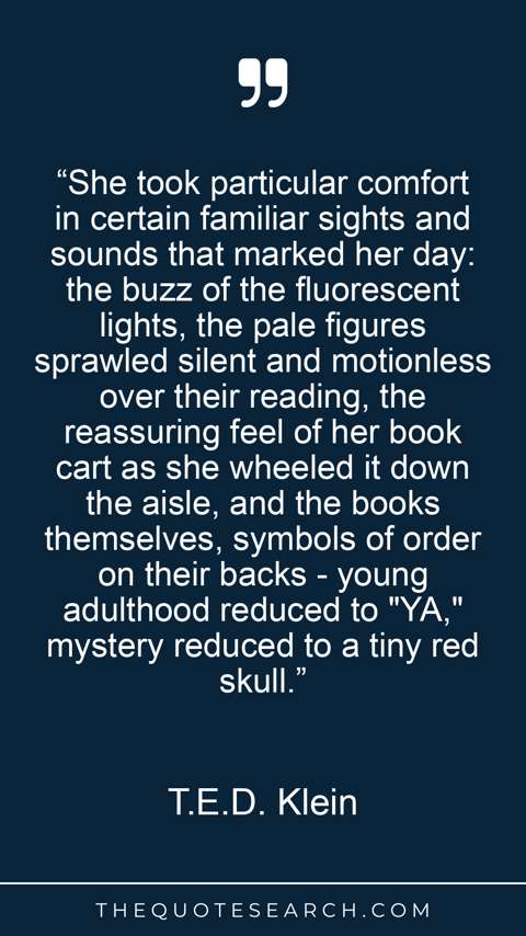 “She took particular comfort in certain familiar sights and sounds that marked her day: the buzz of the fluorescent lights, the pale figures sprawled silent and motionless over their reading, the reassuring feel of her book cart as she wheeled it down the aisle, and the books themselves, symbols of order on their backs - young adulthood reduced to "YA," mystery reduced to a tiny red skull.”