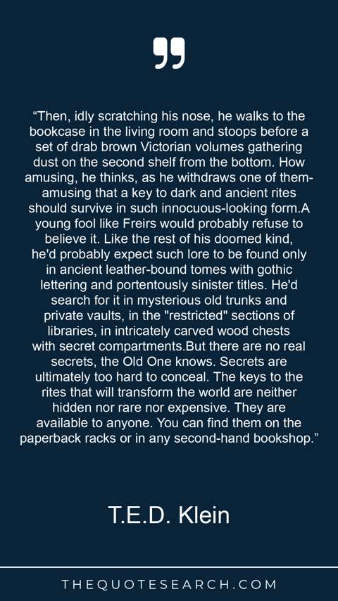 “Then, idly scratching his nose, he walks to the bookcase in the living room and stoops before a set of drab brown Victorian volumes gathering dust on the second shelf from the bottom. How amusing, he thinks, as he withdraws one of them-amusing that a key to dark and ancient rites should survive in such innocuous-looking form.A young fool like Freirs would probably refuse to believe it. Like the rest of his doomed kind, he'd probably expect such lore to be found only in ancient leather-bound tomes with gothic lettering and portentously sinister titles. He'd search for it in mysterious old trunks and private vaults, in the "restricted" sections of libraries, in intricately carved wood chests with secret compartments.But there are no real secrets, the Old One knows. Secrets are ultimately too hard to conceal. The keys to the rites that will transform the world are neither hidden nor rare nor expensive. They are available to anyone. You can find them on the paperback racks or in any second-hand bookshop.”