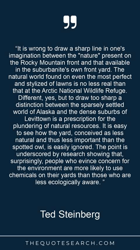“It is wrong to draw a sharp line in one's imagination between the "nature" present on the Rocky Mountain front and that available in the suburbanite's own front yard. The natural world found on even the most perfect and stylized of lawns is no less real than that at the Arctic National Wildlife Refuge. Different, yes, but to draw too sharp a distinction between the sparsely settled world of Alaska and the dense suburbs of Levittown is a prescription for the plundering of natural resources. It is easy to see how the yard, conceived as less natural and thus less important than the spotted owl, is easily ignored. The point is underscored by research showing that, surprisingly, people who evince concern for the environment are more likely to use chemicals on their yards than those who are less ecologically aware. ”