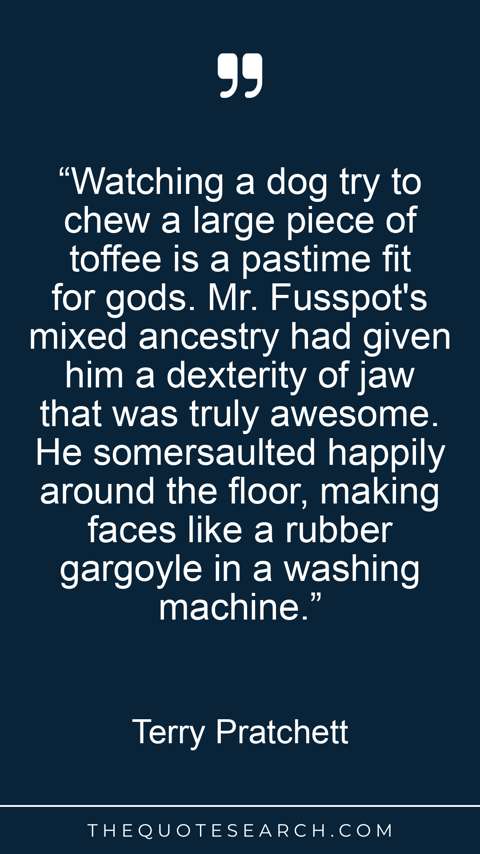 “Watching a dog try to chew a large piece of toffee is a pastime fit for gods. Mr. Fusspot's mixed ancestry had given him a dexterity of jaw that was truly awesome. He somersaulted happily around the floor, making faces like a rubber gargoyle in a washing machine.”