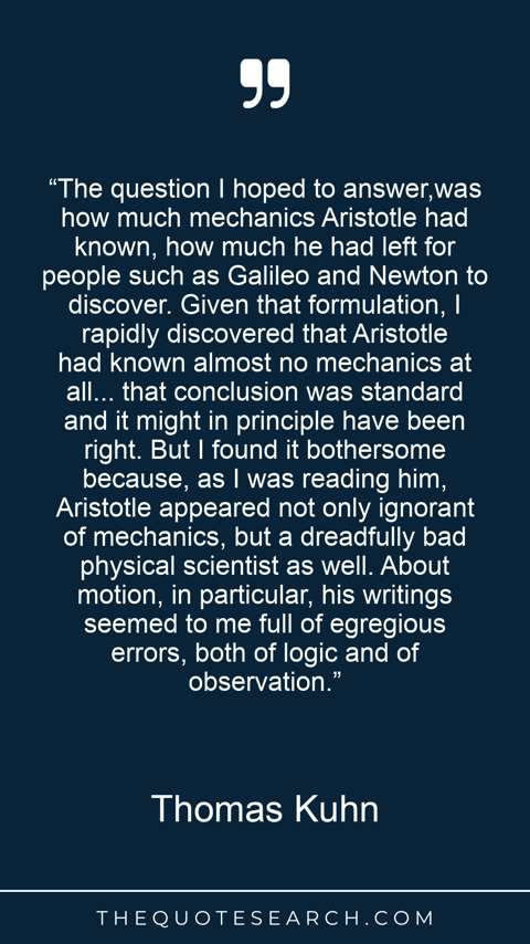 “The question I hoped to answer,was how much mechanics Aristotle had known, how much he had left for people such as Galileo and Newton to discover. Given that formulation, I rapidly discovered that Aristotle had known almost no mechanics at all... that conclusion was standard and it might in principle have been right. But I found it bothersome because, as I was reading him, Aristotle appeared not only ignorant of mechanics, but a dreadfully bad physical scientist as well. About motion, in particular, his writings seemed to me full of egregious errors, both of logic and of observation.”