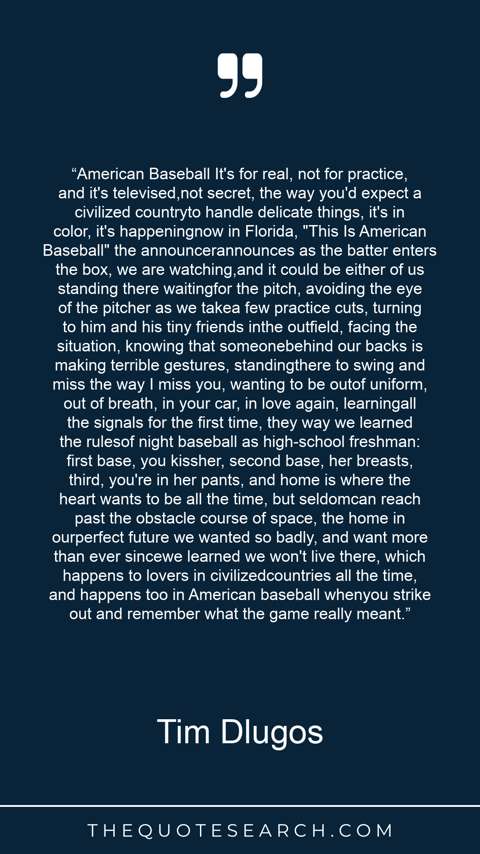 “American Baseball It's for real, not for practice, and it's televised,not secret, the way you'd expect a civilized countryto handle delicate things, it's in color, it's happeningnow in Florida, "This Is American Baseball" the announcerannounces as the batter enters the box, we are watching,and it could be either of us standing there waitingfor the pitch, avoiding the eye of the pitcher as we takea few practice cuts, turning to him and his tiny friends inthe outfield, facing the situation, knowing that someonebehind our backs is making terrible gestures, standingthere to swing and miss the way I miss you, wanting to be outof uniform, out of breath, in your car, in love again, learningall the signals for the first time, they way we learned the rulesof night baseball as high-school freshman: first base, you kissher, second base, her breasts, third, you're in her pants, and home is where the heart wants to be all the time, but seldomcan reach past the obstacle course of space, the home in ourperfect future we wanted so badly, and want more than ever sincewe learned we won't live there, which happens to lovers in civilizedcountries all the time, and happens too in American baseball whenyou strike out and remember what the game really meant.”