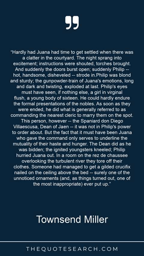 “Hardly had Juana had time to get settled when there was a clatter in the courtyard. The night sprang into excitement; instructions were shouted, torches brought. And suddenly the doors burst open; suddenly Philip -- hot, handsome, disheveled -- strode in.Philip was blond and sturdy; the gunpowder-train of Juana's emotions, long and dark and twisting, exploded at last. Philip's eyes must have seen, if nothing else, a girl in virginal flush, a young body of sixteen. He could hardly endure the formal presentations of the nobles. As soon as they were ended, he did what is generally referred to as commanding the nearest cleric to marry them on the spot. This person, however -- the Spaniard don Diego Villaescusa, Dean of Jaen -- it was not in Philip's power to order about. But the fact that it must have been Juana who gave the command only serves to underline the mutuality of their haste and hunger. The Dean did as he was bidden; the ignited youngsters kneeled; Philip hurried Juana out. In a room on the rez de chaussee overlooking the turbulent river they tore off their clothes. Someone had managed to get a gilded crucifix nailed on the ceiling above the bed -- surely one of the unnoticed ornaments (and, as things turned out, one of the most inappropriate) ever put up.”