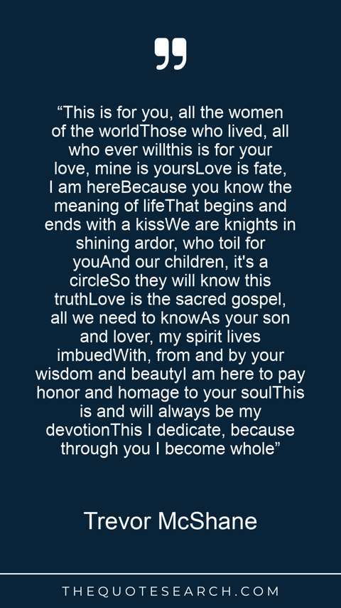 “This is for you, all the women of the worldThose who lived, all who ever willthis is for your love, mine is yoursLove is fate, I am hereBecause you know the meaning of lifeThat begins and ends with a kissWe are knights in shining ardor, who toil for youAnd our children, it's a circleSo they will know this truthLove is the sacred gospel, all we need to knowAs your son and lover, my spirit lives imbuedWith, from and by your wisdom and beautyI am here to pay honor and homage to your soulThis is and will always be my devotionThis I dedicate, because through you I become whole”