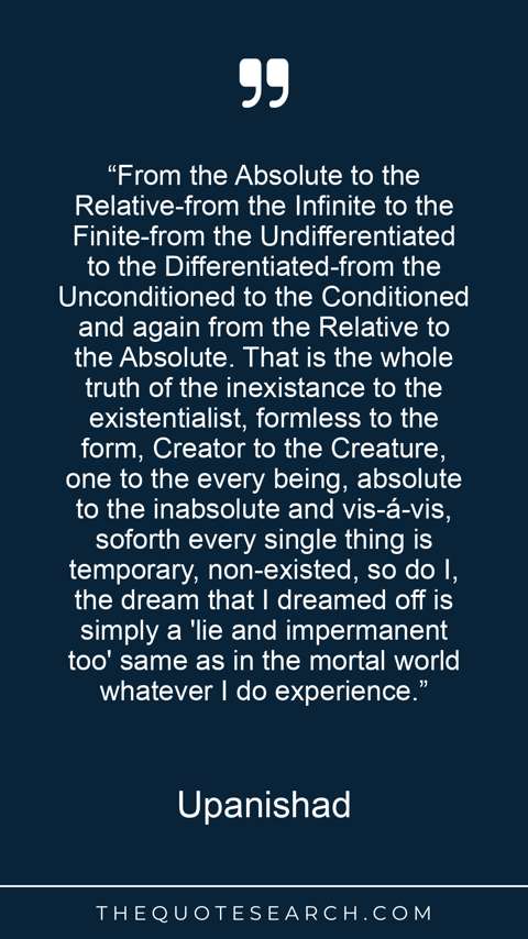 “From the Absolute to the Relative-from the Infinite to the Finite-from the Undifferentiated to the Differentiated-from the Unconditioned to the Conditioned and again from the Relative to the Absolute. That is the whole truth of the inexistance to the existentialist, formless to the form, Creator to the Creature, one to the every being, absolute to the inabsolute and vis-á-vis, soforth every single thing is temporary, non-existed, so do I, the dream that I dreamed off is simply a 'lie and impermanent too' same as in the mortal world whatever I do experience.”
