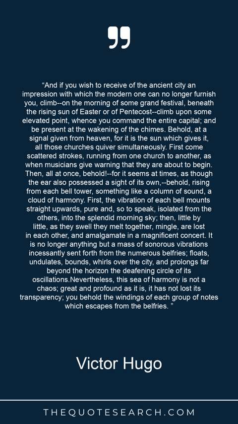 “And if you wish to receive of the ancient city an impression with which the modern one can no longer furnish you, climb--on the morning of some grand festival, beneath the rising sun of Easter or of Pentecost--climb upon some elevated point, whence you command the entire capital; and be present at the wakening of the chimes. Behold, at a signal given from heaven, for it is the sun which gives it, all those churches quiver simultaneously. First come scattered strokes, running from one church to another, as when musicians give warning that they are about to begin. Then, all at once, behold!--for it seems at times, as though the ear also possessed a sight of its own,--behold, rising from each bell tower, something like a column of sound, a cloud of harmony. First, the vibration of each bell mounts straight upwards, pure and, so to speak, isolated from the others, into the splendid morning sky; then, little by little, as they swell they melt together, mingle, are lost in each other, and amalgamate in a magnificent concert. It is no longer anything but a mass of sonorous vibrations incessantly sent forth from the numerous belfries; floats, undulates, bounds, whirls over the city, and prolongs far beyond the horizon the deafening circle of its oscillations.Nevertheless, this sea of harmony is not a chaos; great and profound as it is, it has not lost its transparency; you behold the windings of each group of notes which escapes from the belfries. ”