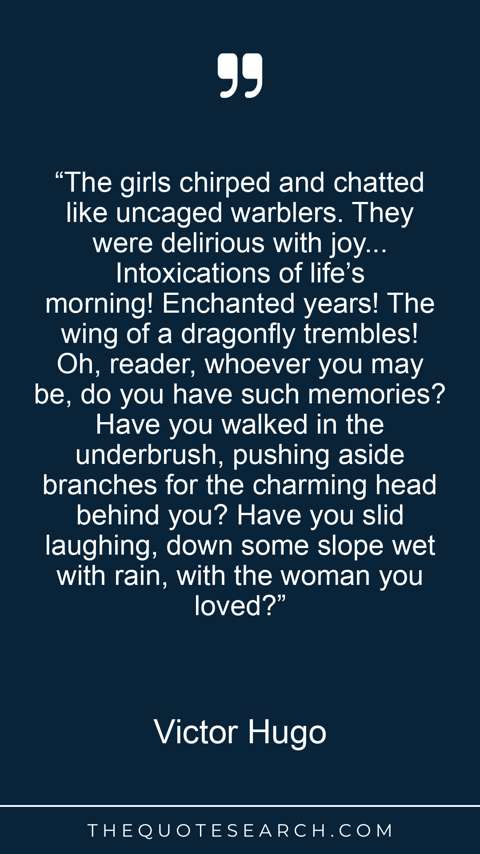 “The girls chirped and chatted like uncaged warblers. They were delirious with joy... Intoxications of life’s morning! Enchanted years! The wing of a dragonfly trembles! Oh, reader, whoever you may be, do you have such memories? Have you walked in the underbrush, pushing aside branches for the charming head behind you? Have you slid laughing, down some slope wet with rain, with the woman you loved?”