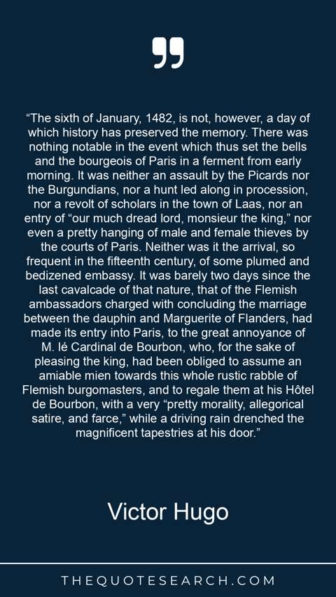 “The sixth of January, 1482, is not, however, a day of which history has preserved the memory. There was nothing notable in the event which thus set the bells and the bourgeois of Paris in a ferment from early morning. It was neither an assault by the Picards nor the Burgundians, nor a hunt led along in procession, nor a revolt of scholars in the town of Laas, nor an entry of “our much dread lord, monsieur the king,” nor even a pretty hanging of male and female thieves by the courts of Paris. Neither was it the arrival, so frequent in the fifteenth century, of some plumed and bedizened embassy. It was barely two days since the last cavalcade of that nature, that of the Flemish ambassadors charged with concluding the marriage between the dauphin and Marguerite of Flanders, had made its entry into Paris, to the great annoyance of M. lé Cardinal de Bourbon, who, for the sake of pleasing the king, had been obliged to assume an amiable mien towards this whole rustic rabble of Flemish burgomasters, and to regale them at his Hôtel de Bourbon, with a very “pretty morality, allegorical satire, and farce,” while a driving rain drenched the magnificent tapestries at his door.”