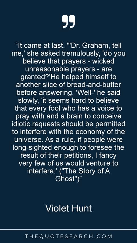 “It came at last. "'Dr. Graham, tell me,' she asked tremulously, 'do you believe that prayers - wicked unreasonable prayers - are granted?'He helped himself to another slice of bread-and-butter before answering. 'Well-' he said slowly, 'it seems hard to believe that every fool who has a voice to pray with and a brain to conceive idiotic requests should be permitted to interfere with the economy of the universe. As a rule, if people were long-sighted enough to foresee the result of their petitions, I fancy very few of us would venture to interfere.' ("The Story of A Ghost")”