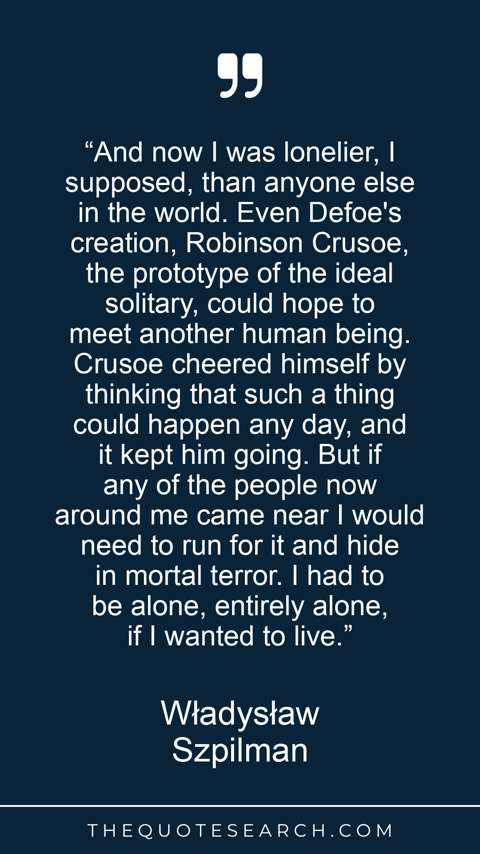 “And now I was lonelier, I supposed, than anyone else in the world. Even Defoe's creation, Robinson Crusoe, the prototype of the ideal solitary, could hope to meet another human being. Crusoe cheered himself by thinking that such a thing could happen any day, and it kept him going. But if any of the people now around me came near I would need to run for it and hide in mortal terror. I had to be alone, entirely alone, if I wanted to live.”