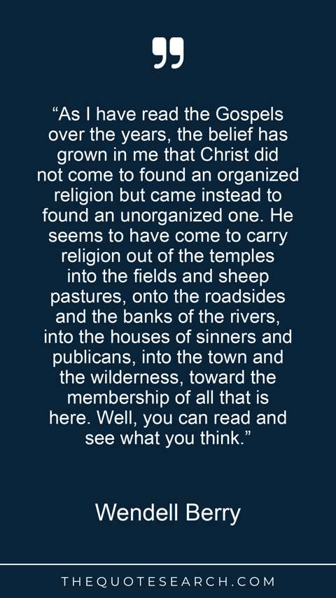“As I have read the Gospels over the years, the belief has grown in me that Christ did not come to found an organized religion but came instead to found an unorganized one. He seems to have come to carry religion out of the temples into the fields and sheep pastures, onto the roadsides and the banks of the rivers, into the houses of sinners and publicans, into the town and the wilderness, toward the membership of all that is here. Well, you can read and see what you think.”