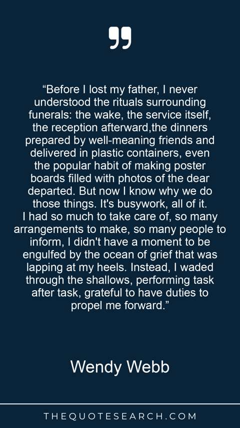 “Before I lost my father, I never understood the rituals surrounding funerals: the wake, the service itself, the reception afterward,the dinners prepared by well-meaning friends and delivered in plastic containers, even the popular habit of making poster boards filled with photos of the dear departed. But now I know why we do those things. It's busywork, all of it. I had so much to take care of, so many arrangements to make, so many people to inform, I didn't have a moment to be engulfed by the ocean of grief that was lapping at my heels. Instead, I waded through the shallows, performing task after task, grateful to have duties to propel me forward.”